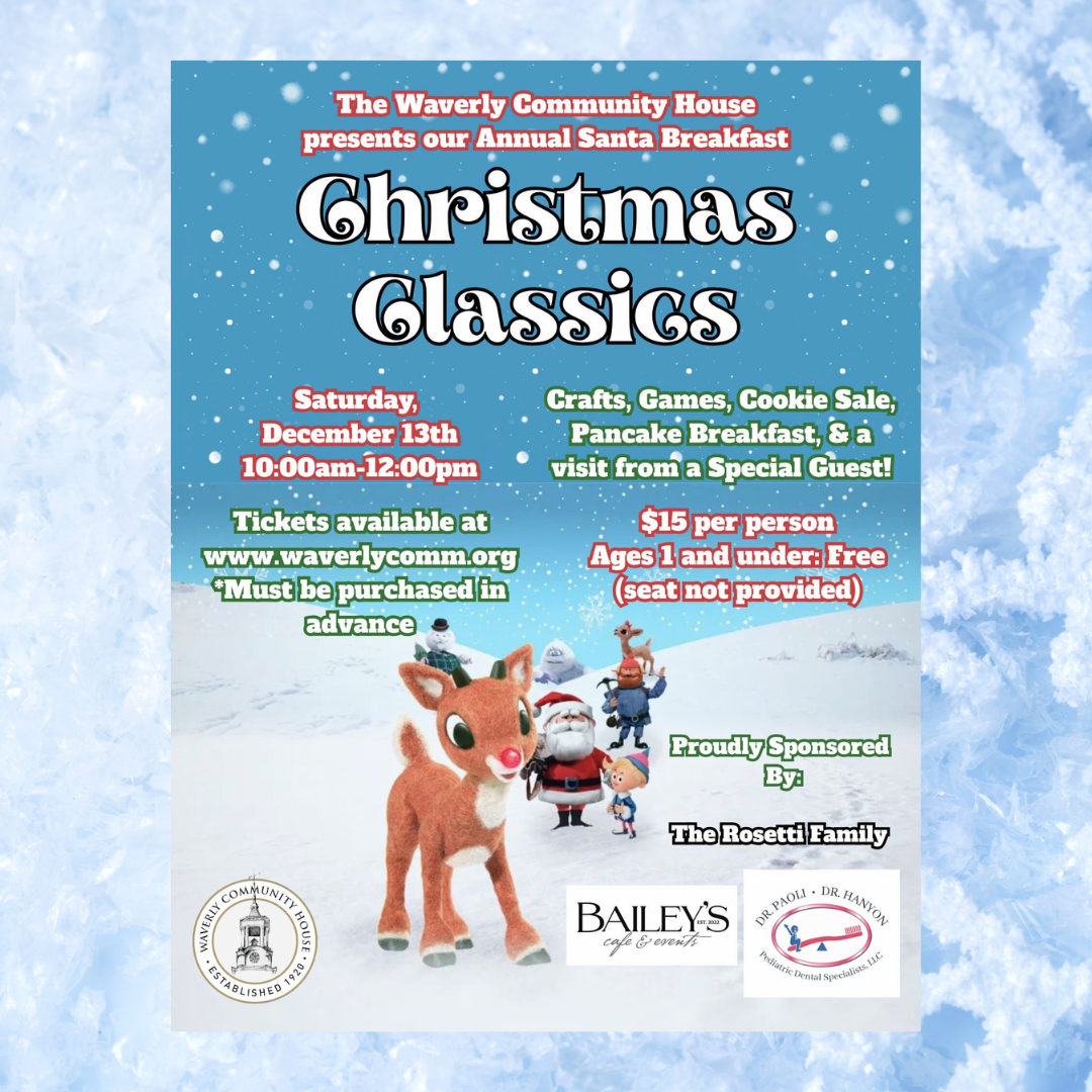 Join us for our 2025 Christmas Classics Santa Breakfast! The event takes place on Saturday, December 13th from 10:00 AM-12:00 PM and will feature crafts, games, a pancake breakfast, and a visit from a special guest! Children aged 1 and under are free. Advanced tickets only. Visit waverlycomm.org to register.