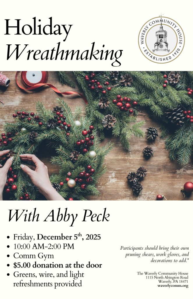 This longstanding holiday tradition takes place in early December every year at The Comm. Abby Peck leads the wreath-making workshop, originally led by her mother, Rosaline. Participants typically make a wreath for themselves, and one for the Comm.