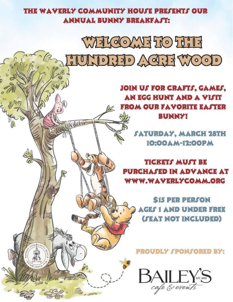 Join us for this year’s Bunny Breakfast, featuring a Winnie the Pooh theme. Gather your family and friends for a warm and welcoming morning filled with delicious breakfast favorites and the charm of the Hundred Acre Wood.
