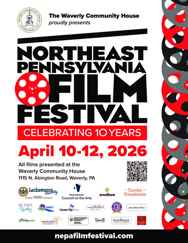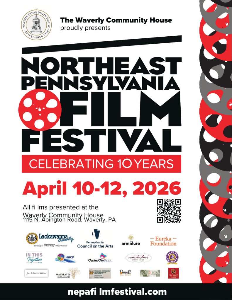 We have an incredible lineup for the 2026 Northeast Pennsylvania Film Festival at the Waverly Community House on April 10th – 12th, 2026. The three-day event occurs exclusively at the Comm and kicks off Friday evening, April 10th, at 6:00 PM.